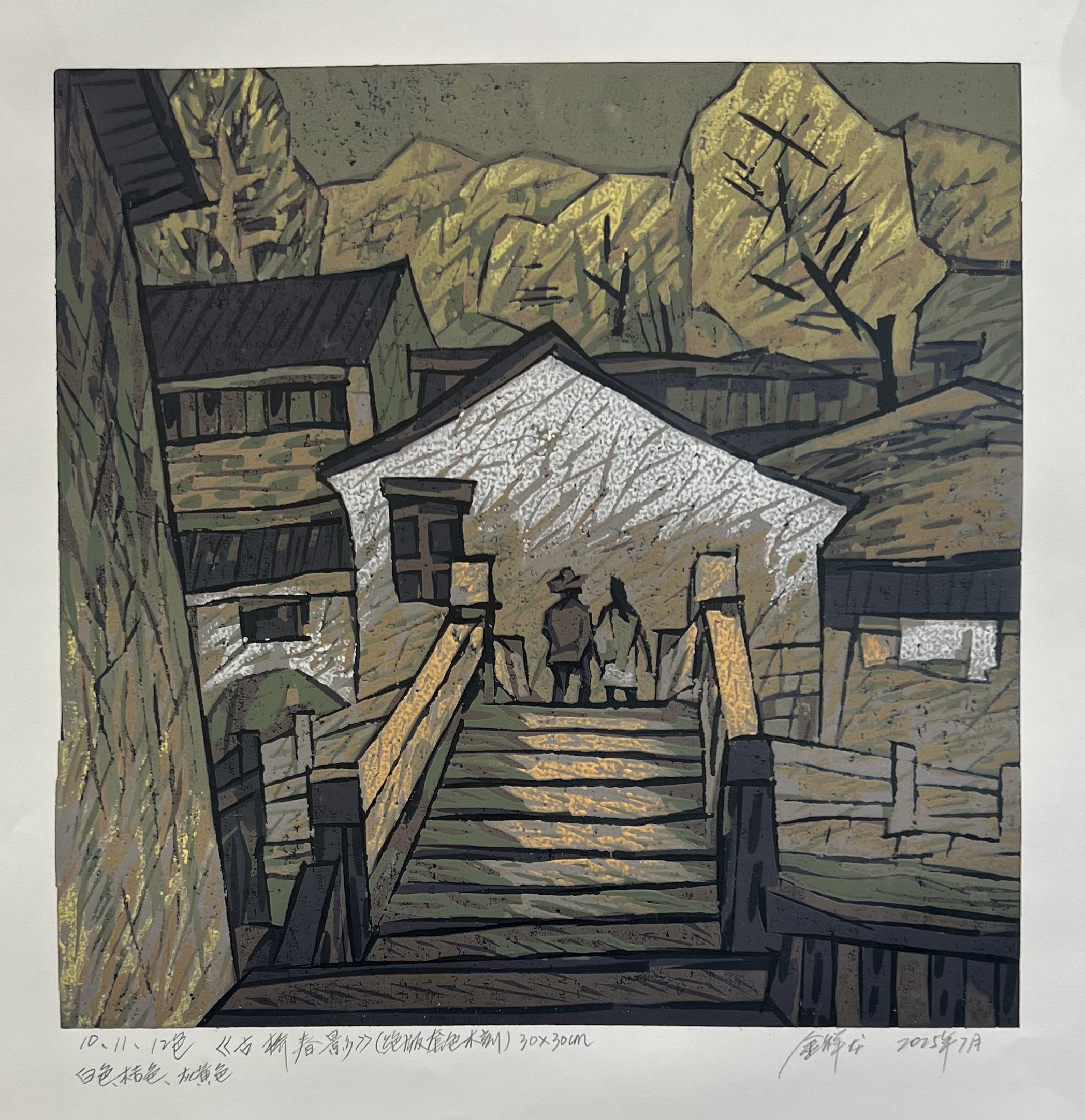 金祥龙采用由深到浅的套色方法创作《古桥春影》